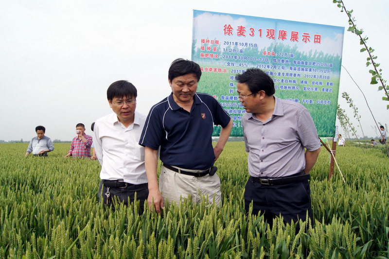 此次观摩会得到了河南省及当地农业主管部门的高度重视和广泛关注,河南省种子管理站及许昌市农业局、种子管理站、所属各县农业局领导全程参加了观摩会。在观摩展示田里,诸位领导与育种专家进行了深入交流,详细询问了“徐麦31”在当地种植表现出的特征特性,对该品种在田间表现出良好的抗病抗虫性大加赞赏,对其优良品质、强筋特性深表认同。在随后召开的会议上,河南省种子管理站副站长陈杰生在发言时认为,豫皖应联手推广应用新品种新技术,确保良种与良法配套到位,扩大“徐麦31”的示范种植面积,实现优质强筋小麦的区域化种植、标准化生产、产业化开发,推动中部地区粮食生产水平的提升,增强农民种粮的积极性和收效。