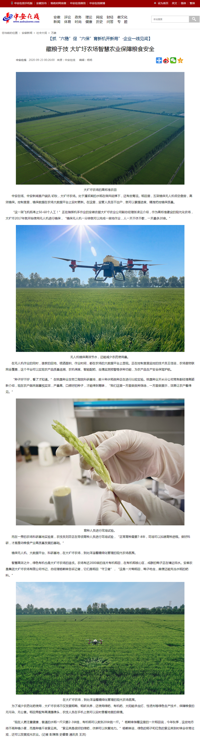 新媒体进垦区看“六稳”“六保”系列报道之一:藏粮于技 大圹圩农场智慧农业保粮食安全