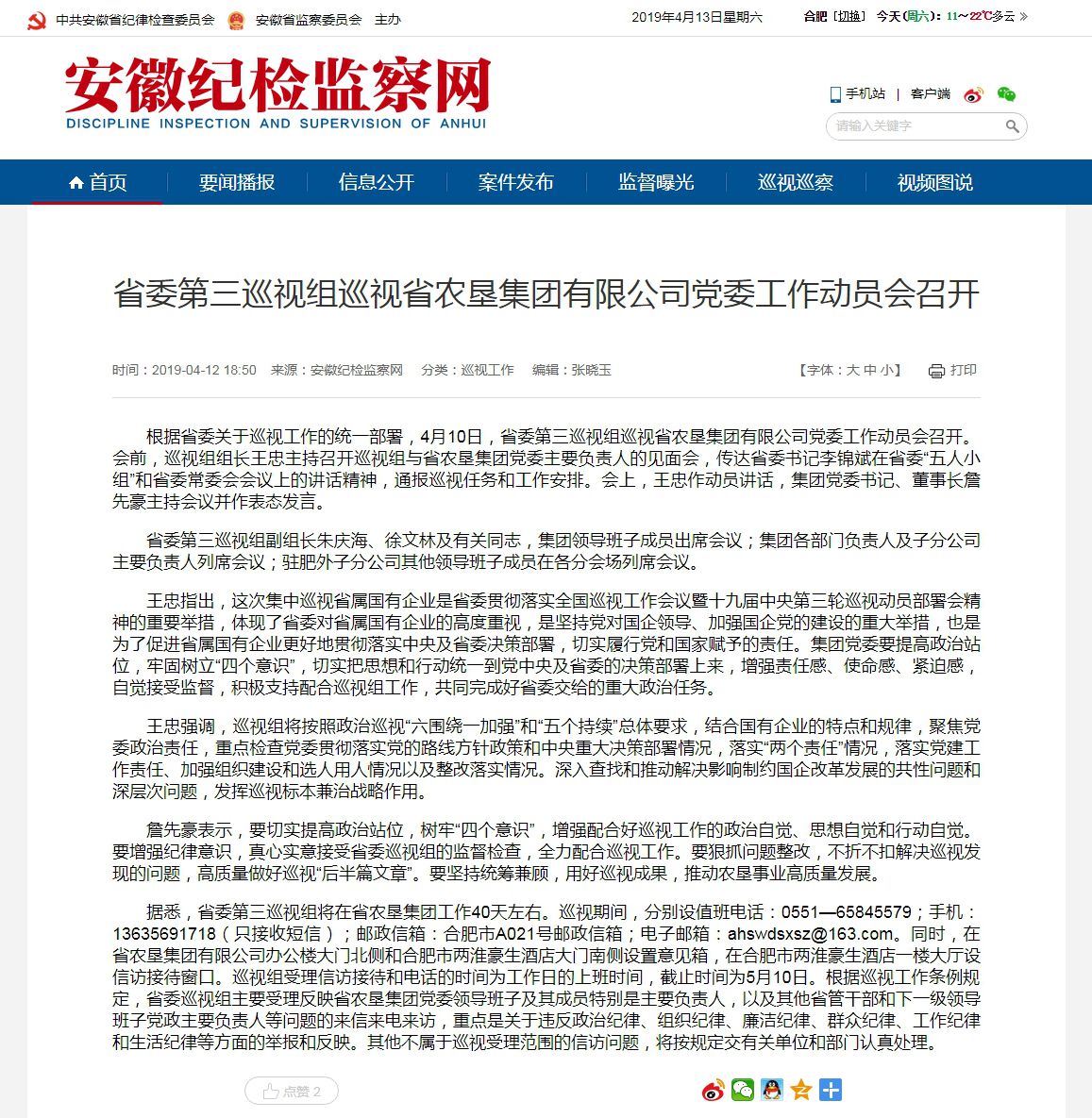 安徽纪检监察网要闻播报-《省委第三巡视组巡视省农垦集团有限公司党委工作动员会召开》,截图如下: