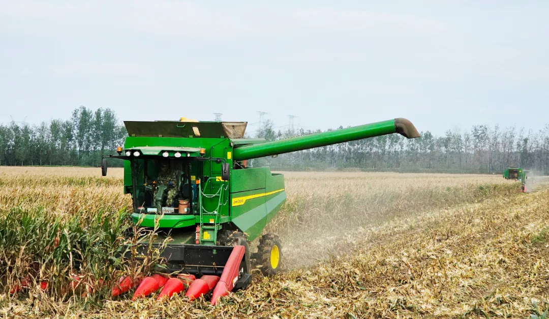在安徽省宿州市埇桥区安徽农垦集团夹沟农场公司的玉米水肥一体化示范基地里,大型联合收割机正在收割玉米。基地负责人蔡中利捧着饱满的玉米穗,向记者算起增收账:“过去浇地靠漫灌、施肥凭经验,现在手机点一点,水肥直接送到玉米根上,一亩地还多收两麻袋!”