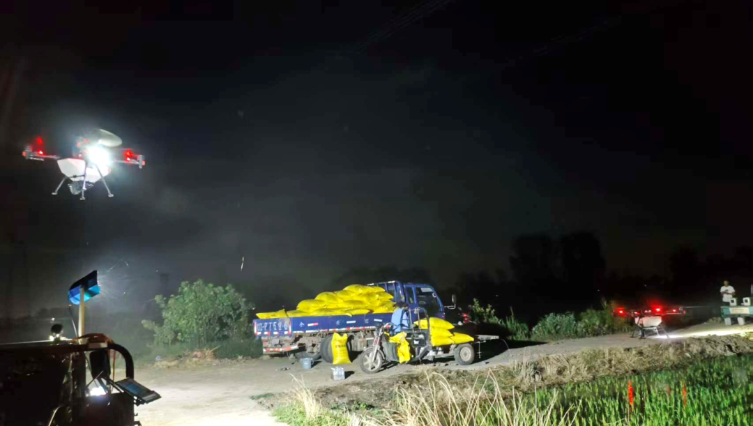 植保无人机夜间施肥作业。