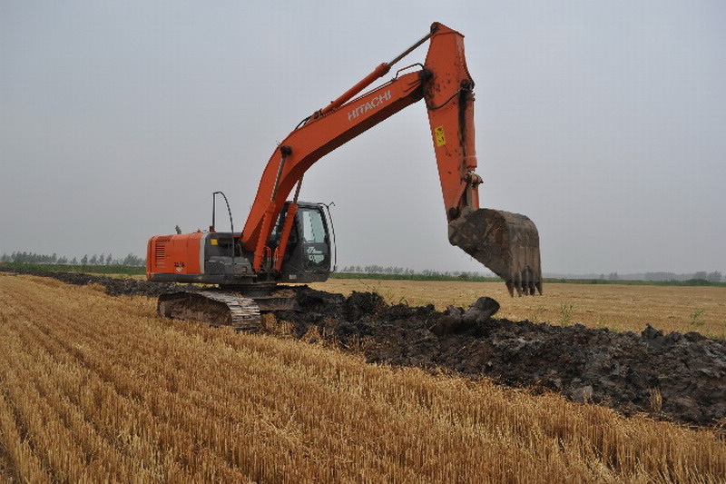 连日来,潘村湖农场抓住午收夏种间隙大打水利穿插战,组织多台大型挖掘机对条田沟进行清淤疏浚,确保沟渠通畅,利于抗旱排涝。图为机械疏浚场景。(杨登宏)