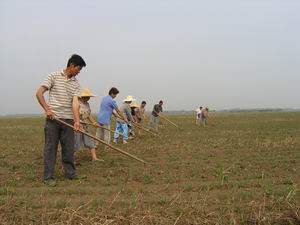 受午季小麦丰收和粮油作物市场价格坚挺的鼓舞, 潘村湖农场职工家庭农场种粮积极性空前高涨。全 场3.2万亩夏大豆苗齐苗壮、长势喜人。连日来,广 大农工在场农技部门的指导下不失时机地展开疏 苗、除草、施肥等夏管工作,力争再夺秋季作物丰 产丰收。图为该场六分场职工以结对互助的形式在 田间疏苗、除草。(杨登宏摄)