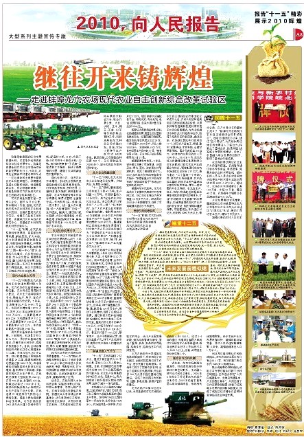 为向全市人民报告十一五精彩,翘望十二五前景,《蚌埠日报》开辟了《2010,向人民报告》大型系列主题宣传专栏,陆续报道全市各条战线上取得的辉煌业绩。蚌埠龙亢农场现代农业自主创新综合改革试验区成立以来,取得了辉煌的发展成就,得到蚌埠市委市政府高度关注。为充分展示试验区现代农业科技自主创新成果、示范引领全市现代农业建设、进一步推动城乡统筹发展,蚌埠市特邀龙亢农场参加此次系列报道。