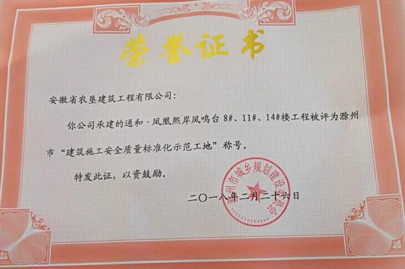 近日,垦建公司承建的“通和·凤凰熙岸凤鸣台”8#、11#、14#楼和“优诗美地”27#-38#楼两项工程,分别被滁州市、宣城市主管部门评为“建筑施工安全质量标准化示范工地”称号,“优诗美地”项目经理程成荣评“优秀项目经理”。